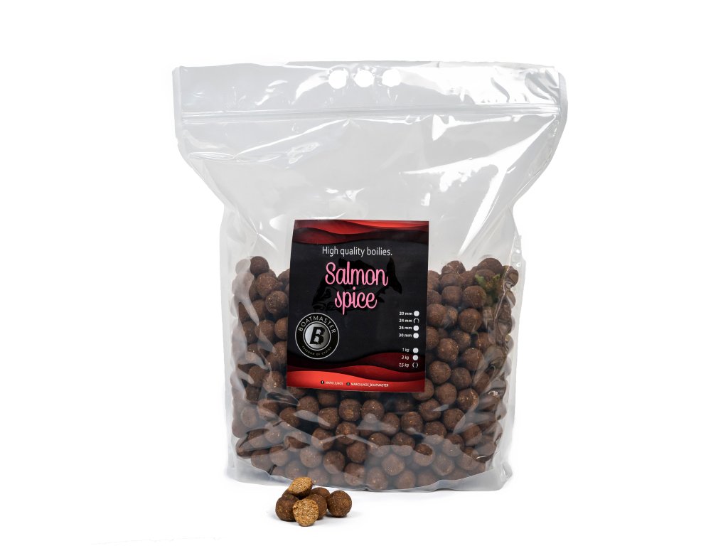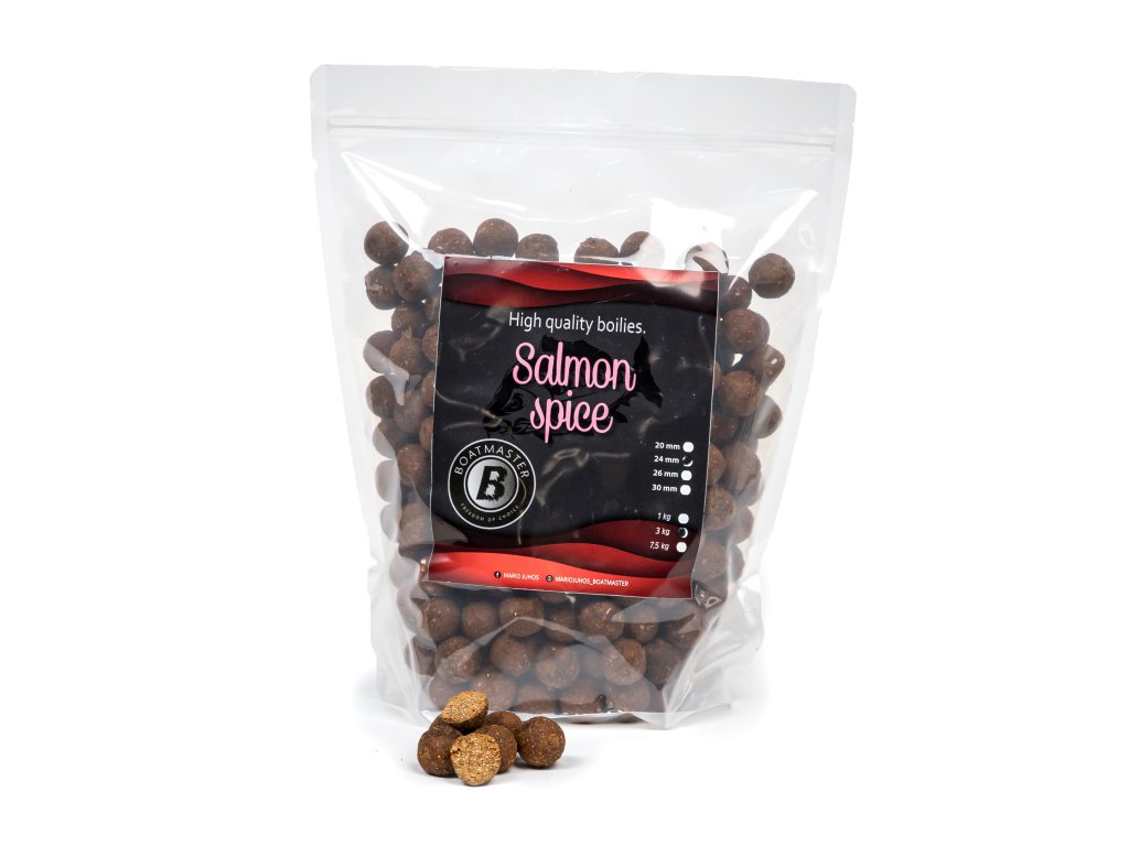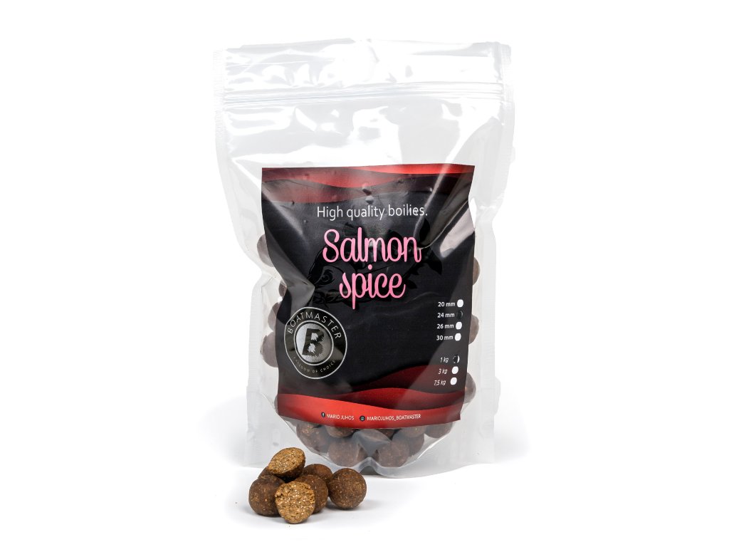 Boilies Salmon spice predstavuje výnimočnú návnadu s vysokým obsahom lososovej múčky a kombináciou ďalších troch rybích múčok. Do mixu sme zahrnuli aj rybí proteín, čo nám zabezpečilo vysoké percento bielkovín. Práve táto kombinácia robí túto radu boilies extrémne atraktívnou pre kapre, a to nielen vďaka intenzívnemu lososovému aroma, ale aj vďaka výživnému obsahu, ktorý privádza kapre k úspešným záberom.
